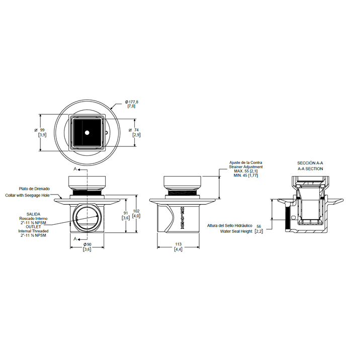 Coladera Cuadrada para inserto con altura de 4 pulgadas. La contra y el portainserto son movibles. Incluye llave para fácil mantenimiento.