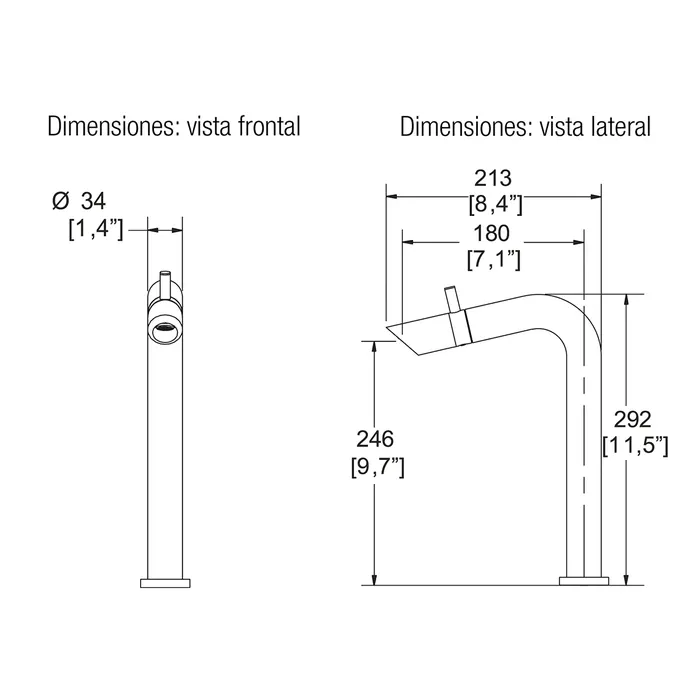 Monomando alto de lavabo. Control de flujo y temperatura con un solo movimiento. Incluye contra de push. Incluye inserto para usarse con lavabos sin rebosadero. Acabado Ébano Cromo. Presión mínima requerida 0.80 kg/cm2. Recomendado para lavabos de sobreponer.
