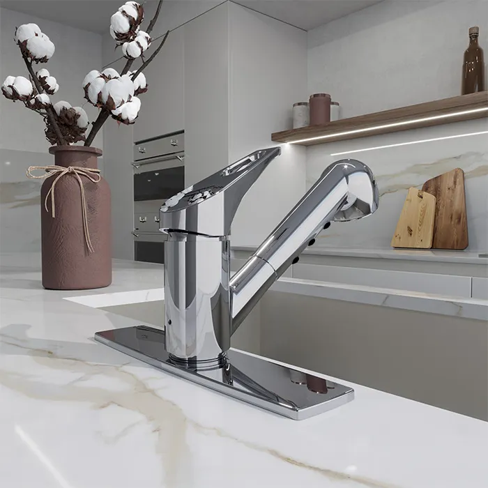 Monomando para fregadero con cabezal retráctil, sistema anticalcáreo y dos tipos de chorro. Cuello giratorio. Acabado Cromo. Presión mínima requerida 0.60kg/cm2.