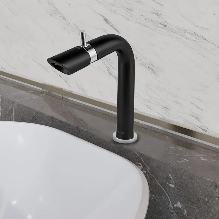 Monomando de lavabo. Control de flujo y temperatura con un solo movimiento. Incluye contra de push. Incluye inserto para usarse con lavabos sin rebosadero. Compatible con lavabos de sobreponer (1 orificio), sobrecubierta o bajocubierta. Acabado Ébano Cromo. Presión mínima requerida 0.80 kg/cm2.