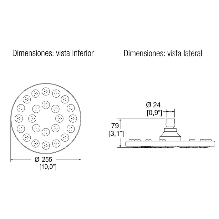 Regadera de chorro fijo con plato ancho de 10″. Acabado Cormo. Presión mínima requerida 1.00 kg/cm2. Consumo mínimo de agua 10 L/min.