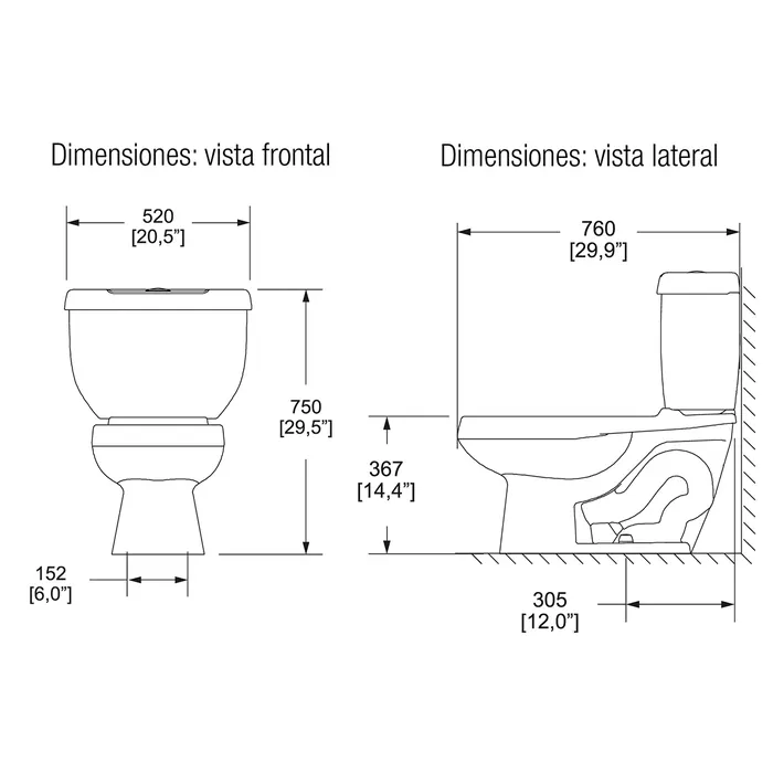 Inodoro, taza y tanque Drakar elongado. Trampa expuesta. Descarga de 4.8 LPD. Botón accionador. No incluye asiento. |